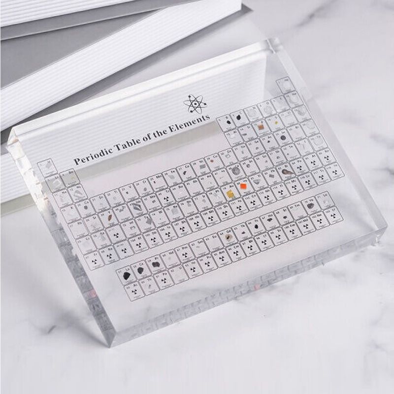 Fall for our Periodic Table With Real Elements Samples, a decoration with 83 inlaid real elements, ideal for science enthusiasts and chemistry students. Combining original decoration and educational support, this unique object in high-quality transparent resin will enhance your space while stimulating learning about the elements.