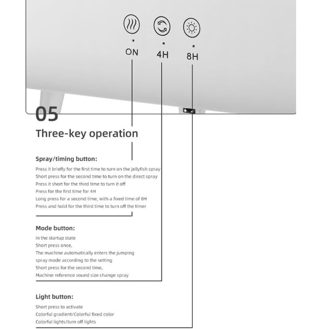 The Jelly-fusion adapts to your every mood with unmatched versatility. Choose the Direct Spray Mode for a powerful, quick blast of humidification that instantly refreshes your space. Or, switch to the mesmerizing Jellyfish Mist Mode for a relaxing visual experience that transforms any room into an oasis of calm. With the power of choice, your environment adjusts to you, not the other way around.
